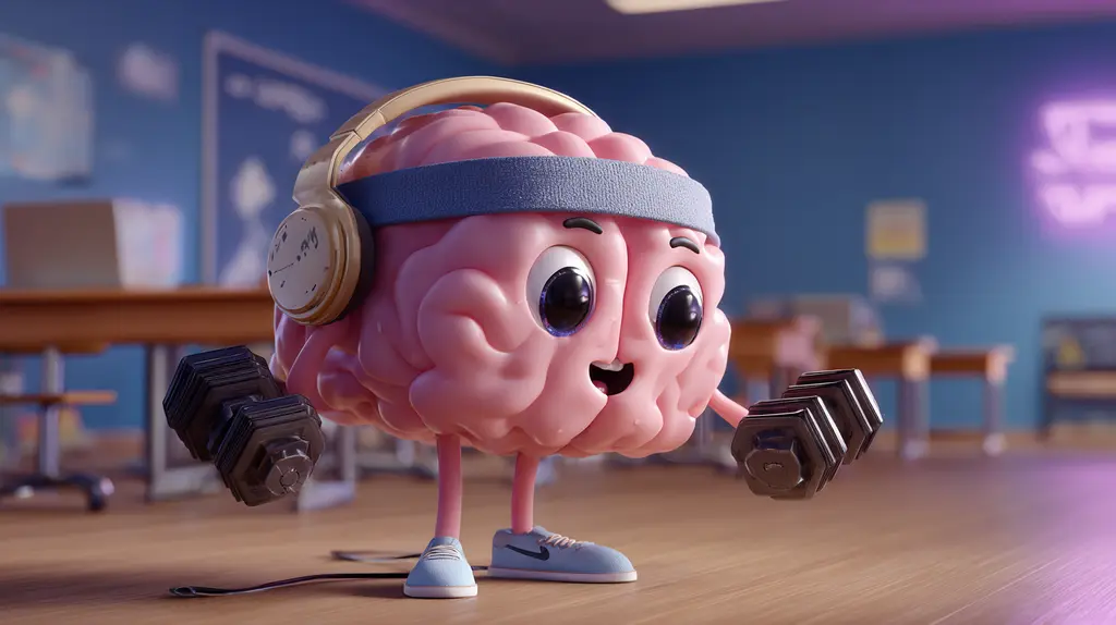Cartoon brain working out with dumbbells, symbolizing cognitive training