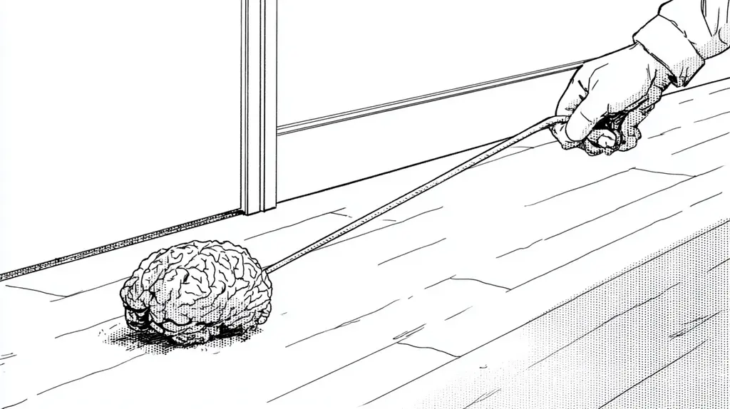 Cartoon brain on a leash being walked, symbolizing control over thoughts